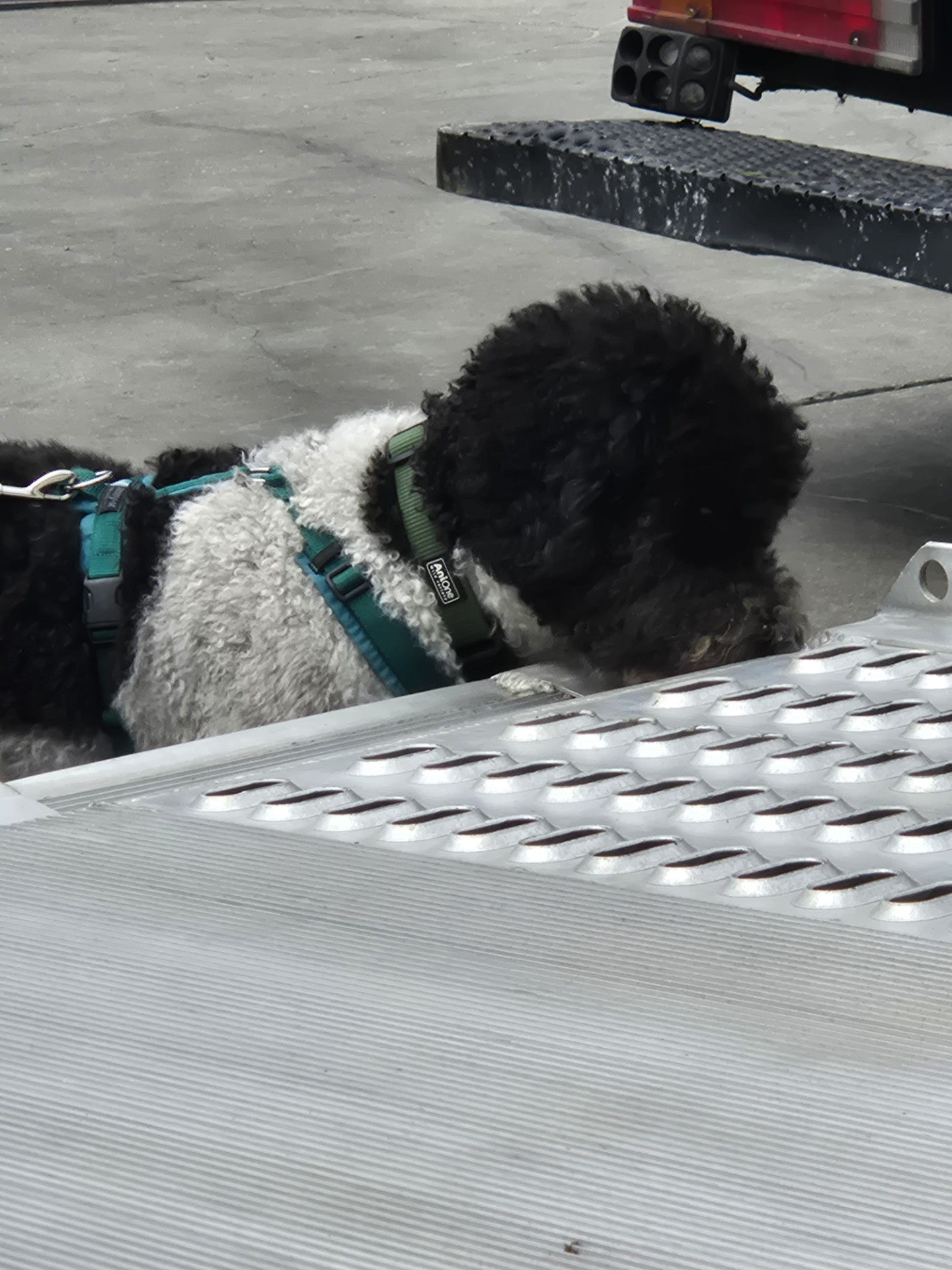 Parkeer buiten het hek. De hond kan daar zijn behoefte doen op de groenstrook, echter ruim de ontlasting wel op.